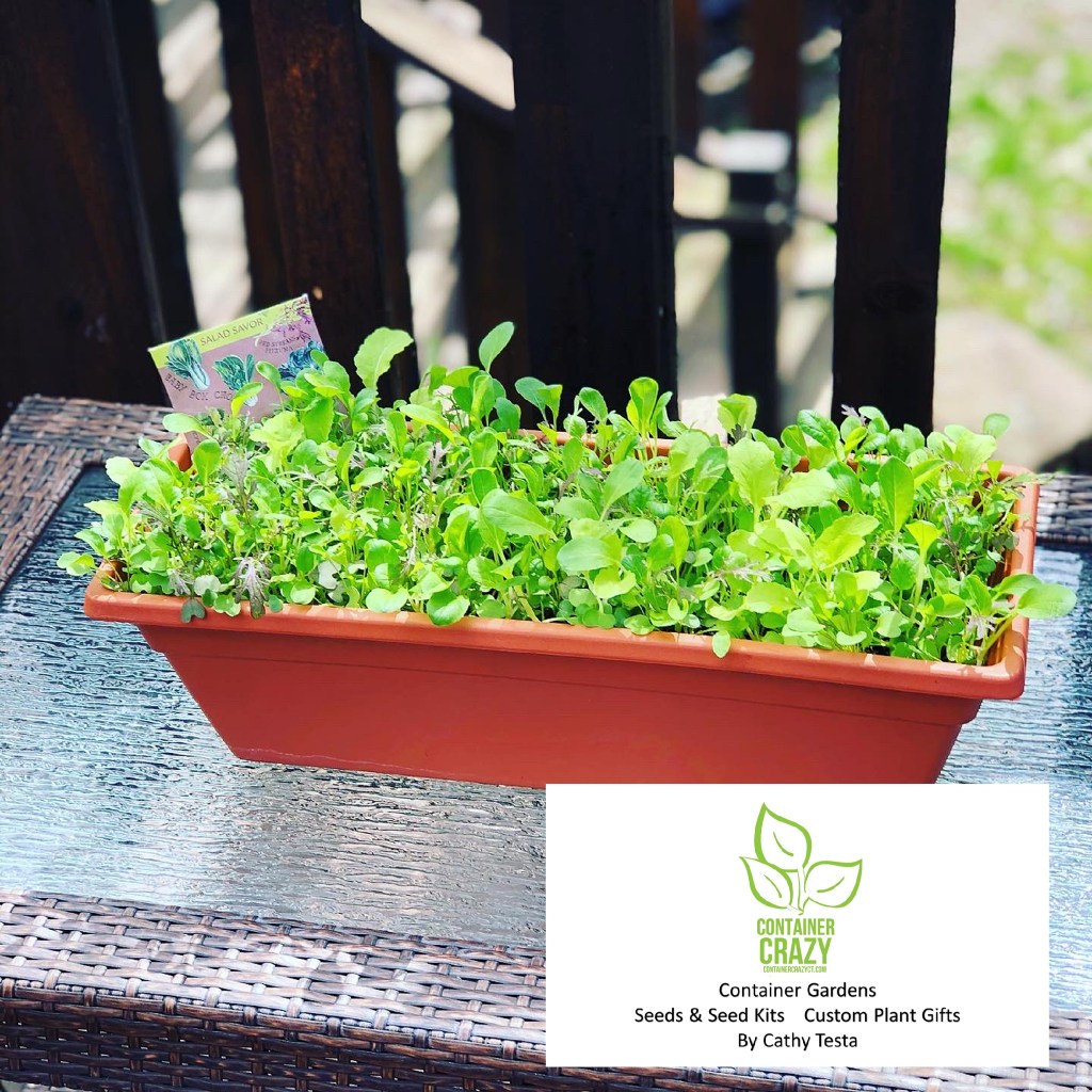 When I say salad mixes, I mean leafy salad (unlike romaine or something like head lettuce). It is also called Salad Greens, rather than lettuce, if you look for seed packets. I often sow salad mix seed in smaller window boxes. And usually start the seed I have in early March at the 10 week before frost date. Here’s a photo of a mix I did in a smaller window box. See how wonderful the mix of greens look! Think of this, March is around the corner. Only 2 weeks away from when I’m writing this (which today is 2/11/2021).