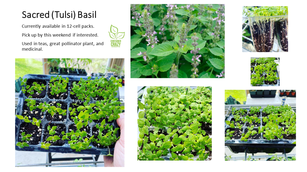 What I discovered is it is a fast grower from seed. It wasn’t long before it would fill my pots or cell trays when I started them from seed. It also has an unusual fragrance, even when it is small and just sprouting from the soil in my seedling trays. The seed producer describes it as, “Pretty, heavenly-scented basil used in teas and Ayurveda.” The seed must be sown early indoors or may be directly sown into gardens.