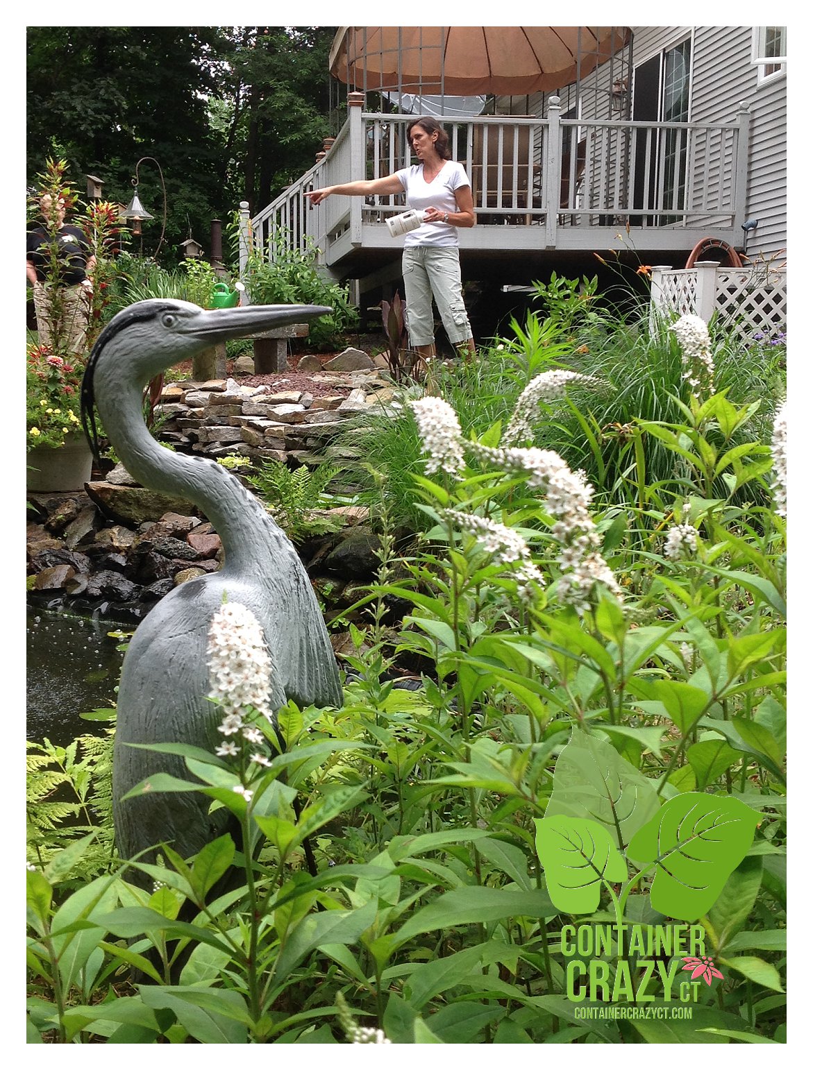 Water or pond gardening is not for weenies – it takes some effort to get it cleaned and prepared every season, but the payoff is grand. And if you were wondering, one of the reasons we were laughing in the above photo is because I shared a story of how Rhonda and I met during our corporate days – when we decided to take a motorcycle riding course together, and how we would ride into work side by side on our Harley Davidson motorcycles. Rhonda still rides today, I, however, gave it up so you can see – she’s no weenie! Makes sense to me that she manages to maintain such a diversity of plant life, fish, and more in her pond gardens.