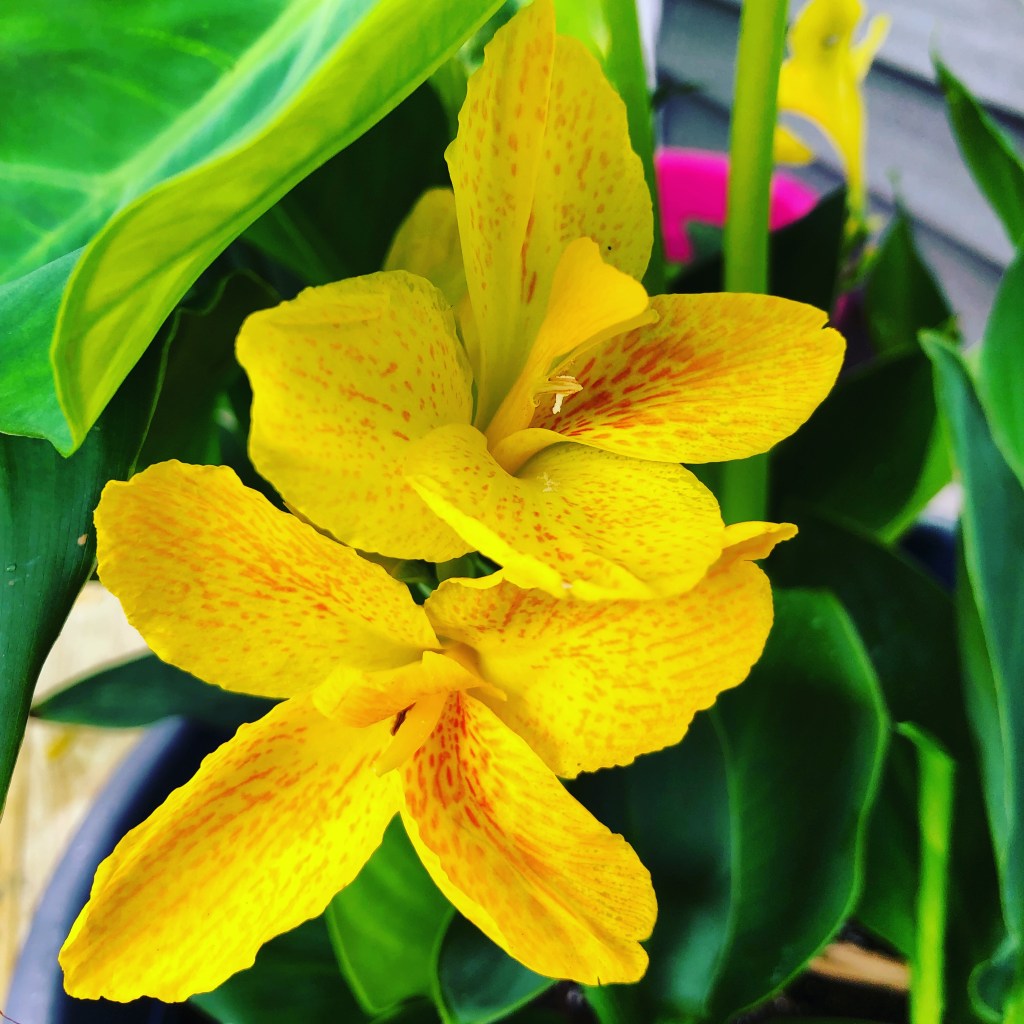 Yellow blooms with red speck of Canna Lily. Love growing Canna Lilies and using them as big tropical thrillers in my container gardens every year.