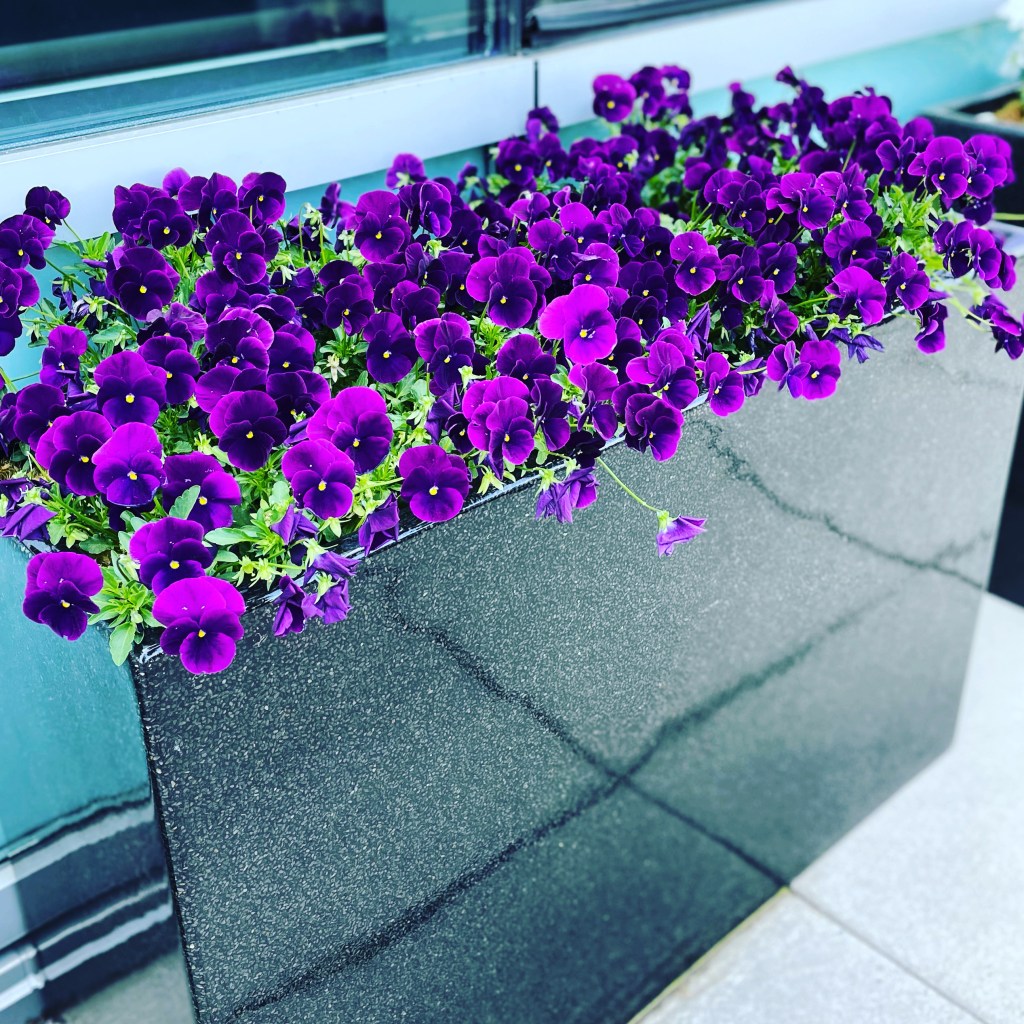 Working on a high rise has many challenges. Try – no water sources outside. Extreme winds that will shred plants. Cold temperatures when I did winter installs. And in the summer, extreme heat. I had a lot to learn and research. And, not to mention, going up and down constantly in an elevator. I am lucky I am a thinker about organization because you have to organize all to be efficient in those situations. And I got to witness how plants respond differently in a high-rise balcony situation in planters, pots, and spaces. Plant colors are different when experiencing extreme heat, they grew to amazing large sizes in some cases, which blew me away. I would plant a small herb and it would reach the size of a shrub by the end of summer. It would shock me sometimes, like wow, they love this sunshine and heat! I read somewhere you could not grow tomatoes on a high-rise, NOT! You sure can and they were wonderful.