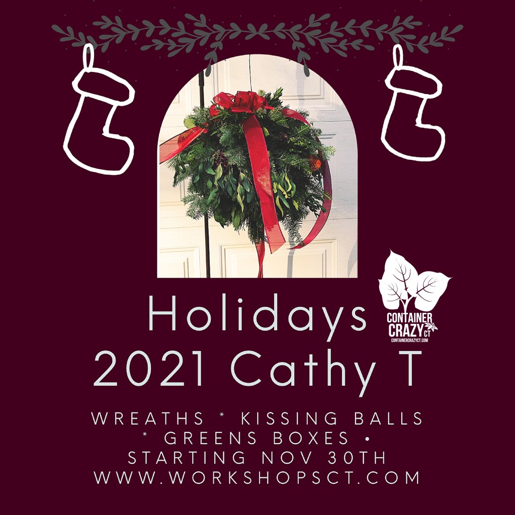 For more information regarding this year’s custom orders, please visit www.WorkshopsCT.com. Please note, Container Crazy CT, is not offering the holiday workshops any longer. This was due to the onset of COVID. However, we are offering custom orders for pick up of wreaths and holiday kissing balls, as well as boxes of fresh greens, if you wish to make your own creation at home. All is arranged by porch-pick-up’s. See the details on site noted above.