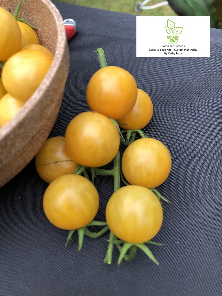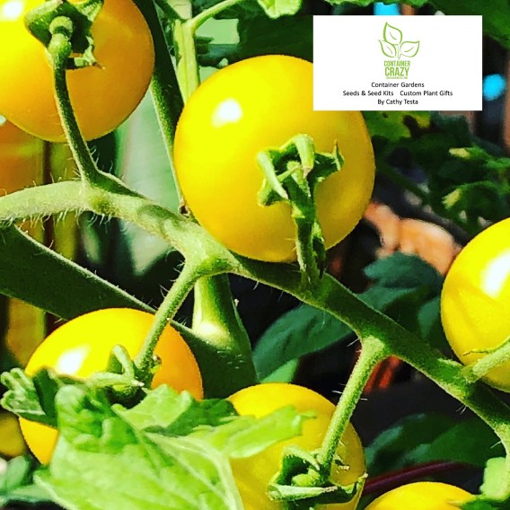The honey drop cherry tomatoes are a beautiful golden color and are very sweet. The seed packet shows a bear going for the tomatoes, and this makes sense to me. They are as sweet as honey. And my honey, Steve, harvested them often for us (or for himself!).