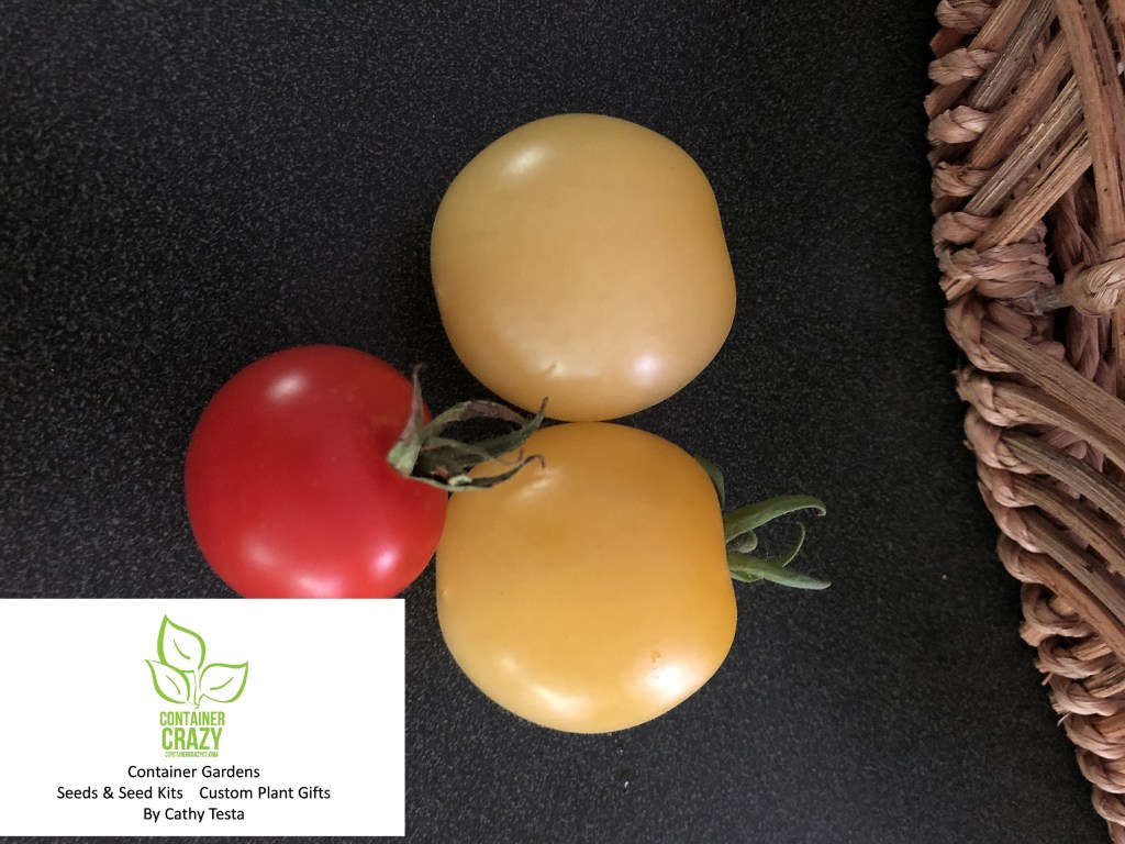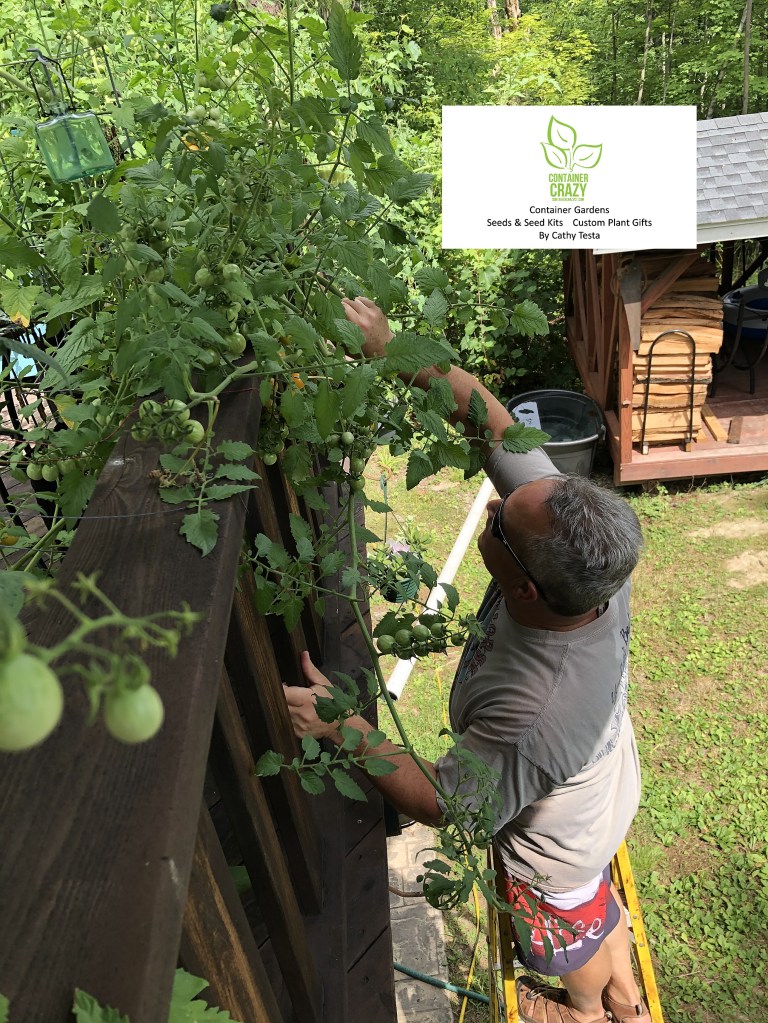 When Steve was gathering them for us from the ladder, of course, I was saying, “Be careful – don’t fall down.” I’m so happy he enjoys tomatoes immensely because I certainly put the effort into growing them (and I enjoy the whole process from start of seeds to the first and continuous tasty bites in summer), and I grow all my plants in container gardens. It is worth the effort for both of us.