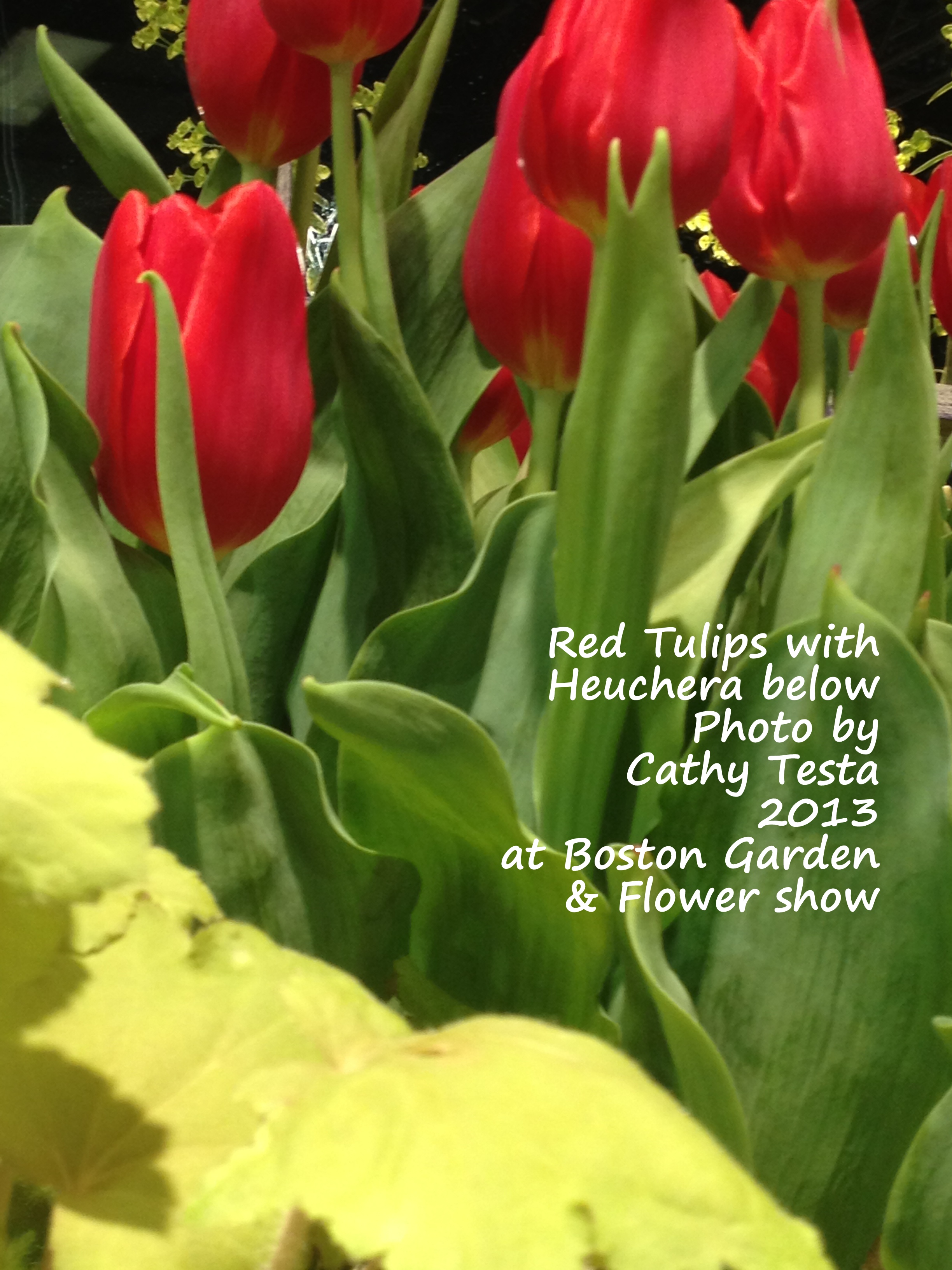 Another arrangement, located at the next display, was a combination of intense red blooming tulips combined with the bright leaves of a Heuchera perennial at the base, and yellow flowers of a Euphorbia perennial to the left of the tulips.