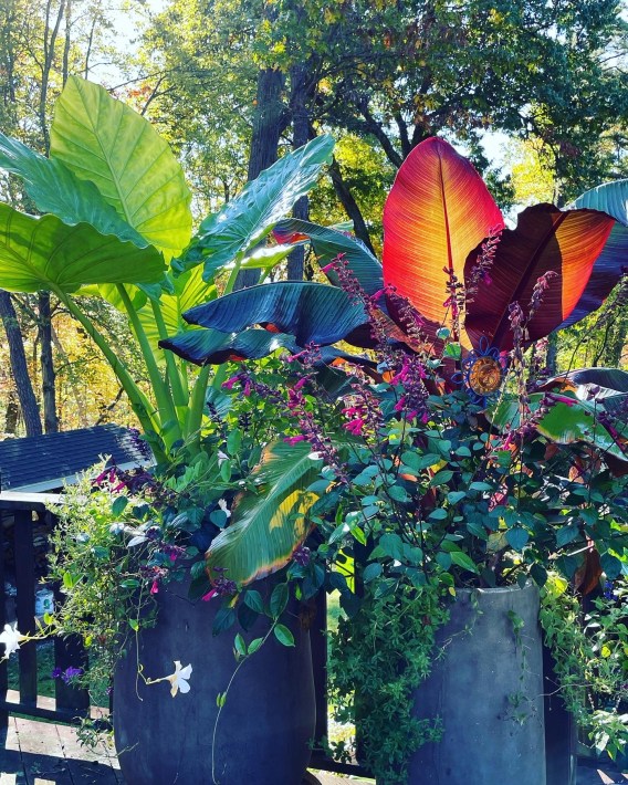 I always fill our long deck along the back of our ranch style home with container gardens filled with plants of all kinds and some vegetables over the years. Tomato plants and hot pepper plants are two of our fav’s. But we have done others like Edamame and pumpkins, just to name two! And of course, many big planters filled with wonderful tropical plants like Ensete, Colocasias, and Canna Lilies.