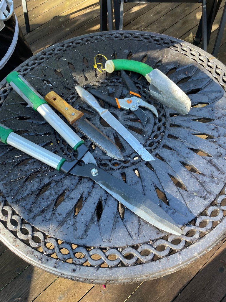 Garden Sheers, Hori Hori Garden Knife, Kitchen Serrated Bread Knife, Pruners, Trowel, and Small Shovel.