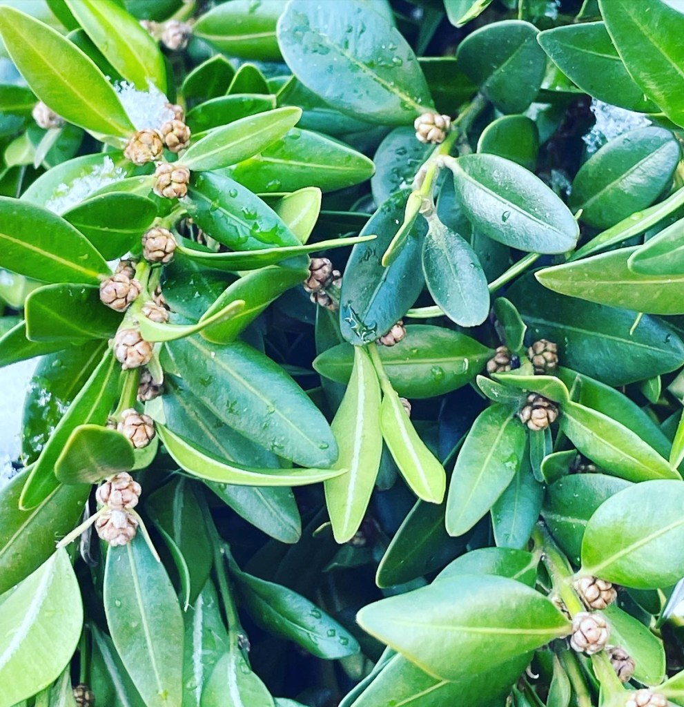 Leave a commentDo you know what the word Buxus is? It is the genus name for boxwood. It’s one of the easier botanical names to remember. Anyhow, boxwood evergreen shrubs have rounded or obovate shaped leaves, on slender green stems. It is a dense evergreen shrub used in landscapes and commonly available at nurseries. It is also a greenery available from floral suppliers or retail locations at nurseries during the winter to make festive arrangements such as fresh greens wreaths and holiday kissing balls.