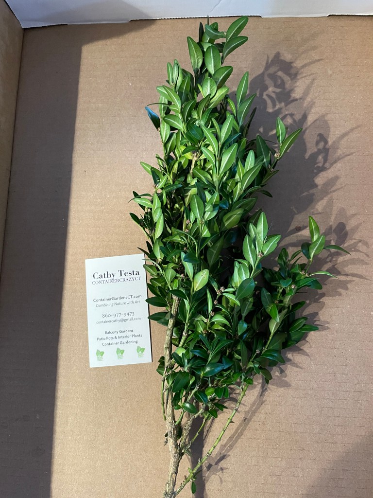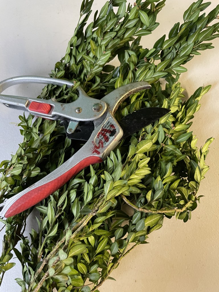 For a couple years, I offered boxwood in my box of greens mixes. These boxes of greens were for people who wanted to make their own wreaths at home. Included were many other fresh greens such as balsam or Douglas fir, Salal lemon Leaf (prior post), yew, silver fir, berried juniper, holly, and more. I never harvested boxwood from my own shrubs or others, but these shrubs are common in the landscapes, so if you happen to have a big enough shrub stash of them, they can be harvested from to add to your holiday wreaths. Typically pruning boxwood is done in the spring but taking some minor cuttings for your arrangements is usually harmless for winter decorations.