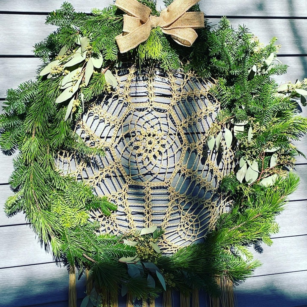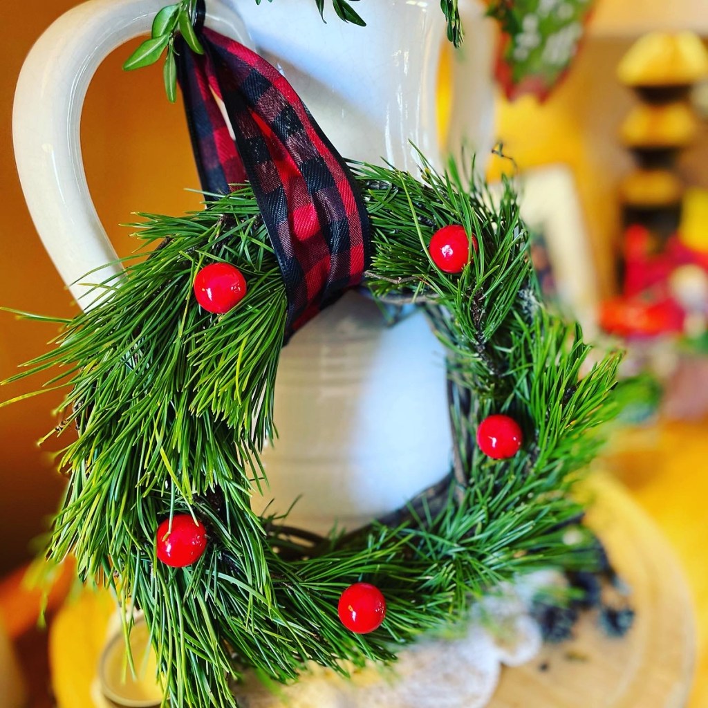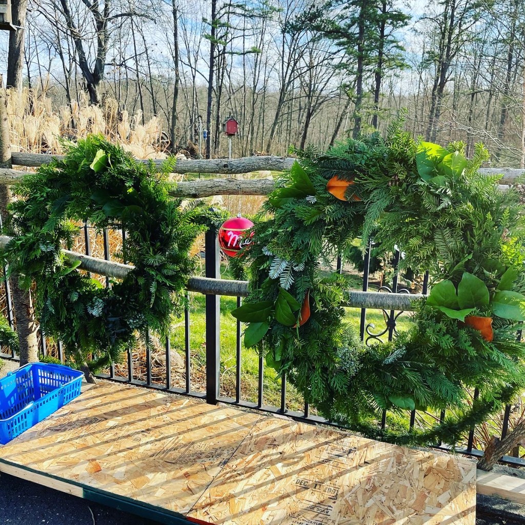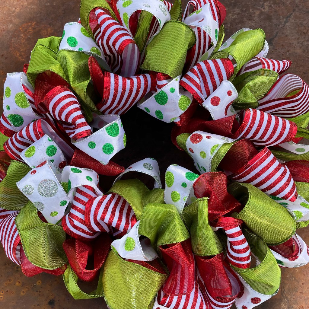 FYI, this year I am not making my greenery wreaths, but I have been creating ribbon wreaths as noted in the prior post. Here’s a photo of one I created below recently for a customer!