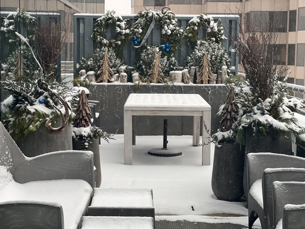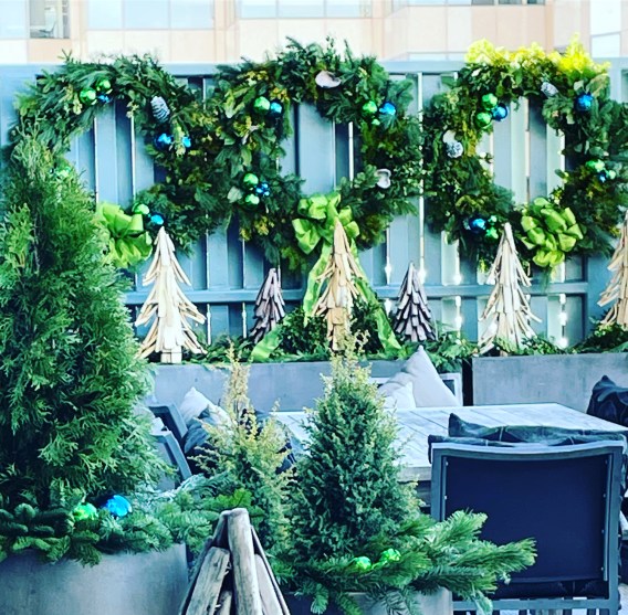 Here’s a photo of the Birch logs before a big snow fall. They were very secure and with the lights at night, pretty! You can see the wreaths there and those are very large wreaths I made. Steve would step up on the planters to install them and my heart skipped a beat every time. We tried to use super big zip ties or cable ties to secure the larger wreaths but sometimes those snapped from the cold, so we ended up using thick wire. Steve had his technique down. I could not have done this part without him. And he is actually afraid of heights, so he never looked to the right at the view 38 floors below. Fortunately, the heights never bothered me up there – I loved the whole scene every time I was doing installations. To see the skyline, hear a hawk go by, and just the overall feel of the scene above and beyond was inspirational.
