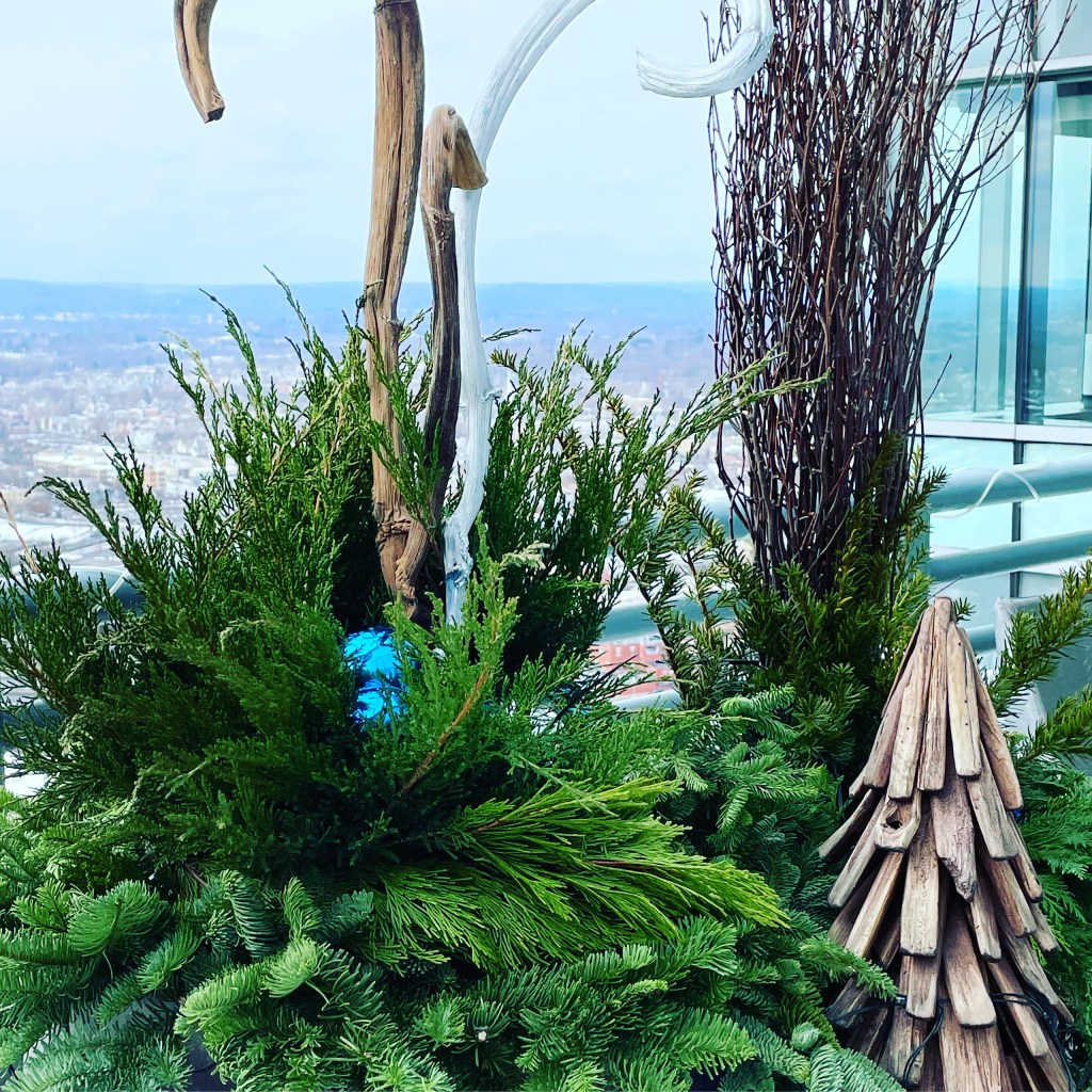 I so wished those thicker curly sticks had worked though – I really liked the natural feel of them as it adds a bit of height to the fresh greens I installed below. Wooden drift like decor trees worked out well – they can hold up to the outdoor various winter elements and I would secure them using rebar. As I did with the twig bundles you see near the wooden tree in this photo. Remember though, it was never as simple as just stick things into soil, like I would do with these types of decorations on the ground level at my home or elsewhere. Everything really needs to hold super well or risk damage or flying away. I would envy those installers of holiday pots and decor as they just stood there sticking stuff in the soft soil on Instagram feeds, because I couldn’t do it that way.