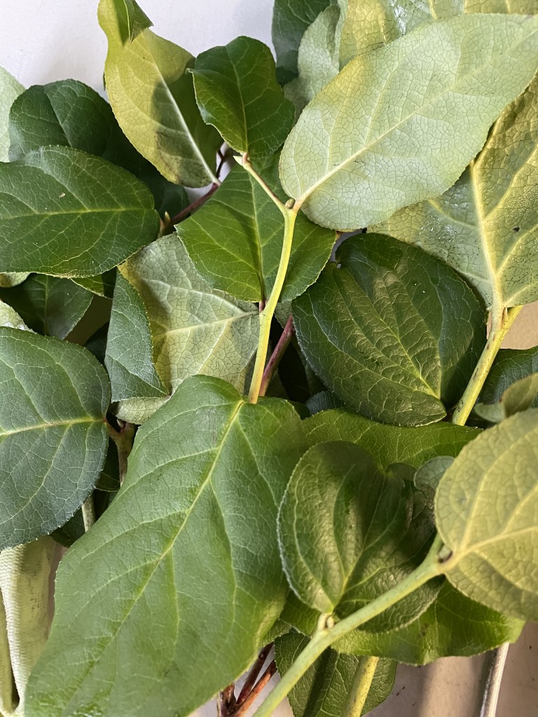 As I read that linked post above, I didn’t realize it grew by rhizomes and I’ve never seen a picture of this plant in its natural state. Apparently, it grows like an understory plant in the forest. It is noted under the botanical name, Gaultheria shallon. It the florist industry, it is listed and commonly known as Salal Lemon Leaf.