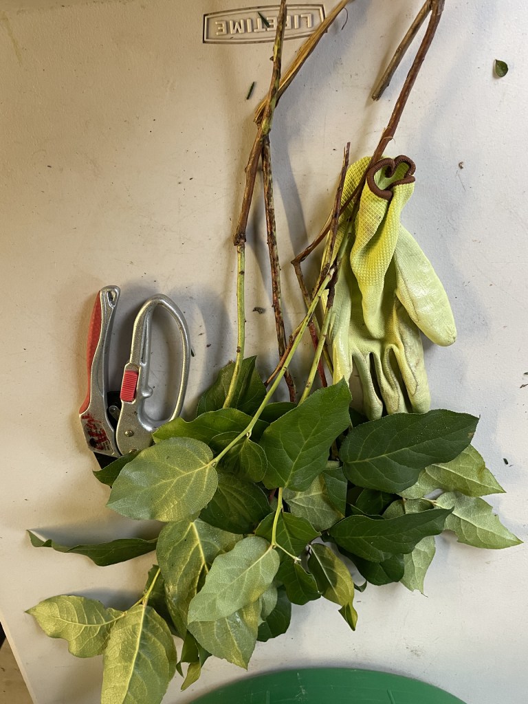 Cutting back the foliage is the first step and is relatively easy to do. Using the garden sheers or the kitchen serrated knife works perfect. I recorded several videos of me doing this and posted them on my Instagram page as well as my Facebook pages under Container Crazy CT if you wish to see how I used the tools to cut all the foliage back. Here are the links: