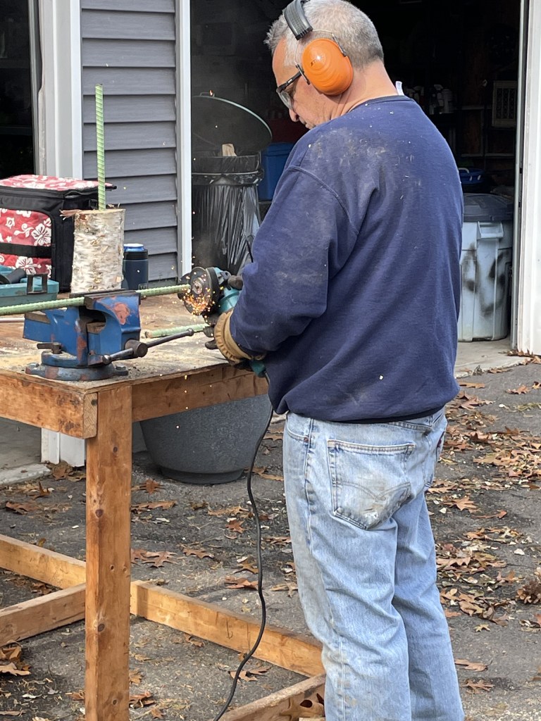 Steve, that Elf Helper of mine, cut the rebar to my desired lengths, and we inserted them into the base of the birch pieces. They were heavy at first as the birch logs were not totally cured or dried out – so imagine we took these up and carried them in to use on the balcony. I really liked how these worked out, and if desired, could be reused the next season. Once they were pushed into the soil, it was very secure.