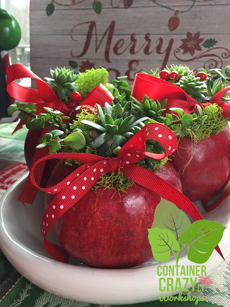 It just came to me one afternoon, and I thought, “Hmm, could these pomegranates be used like succulent topped pumpkins I made in the fall to create a holiday item?”