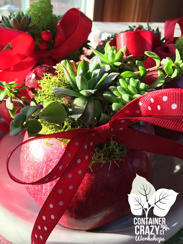 Flash forward to 2016, and just one day I had some pommies at home to eat soon, and that thought came into my mind. I grabbed my glue gun, some of my smaller succulents, made a tiny holiday ribbon bow, and added glitter balls. Voila! They came out so darn cute. And were really fun and easy to create!