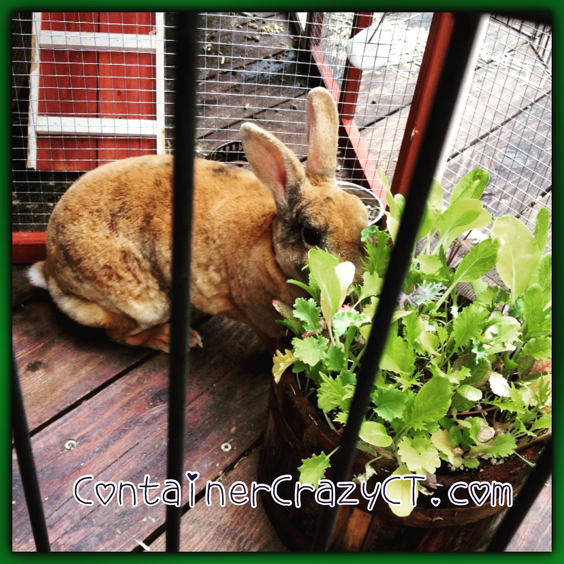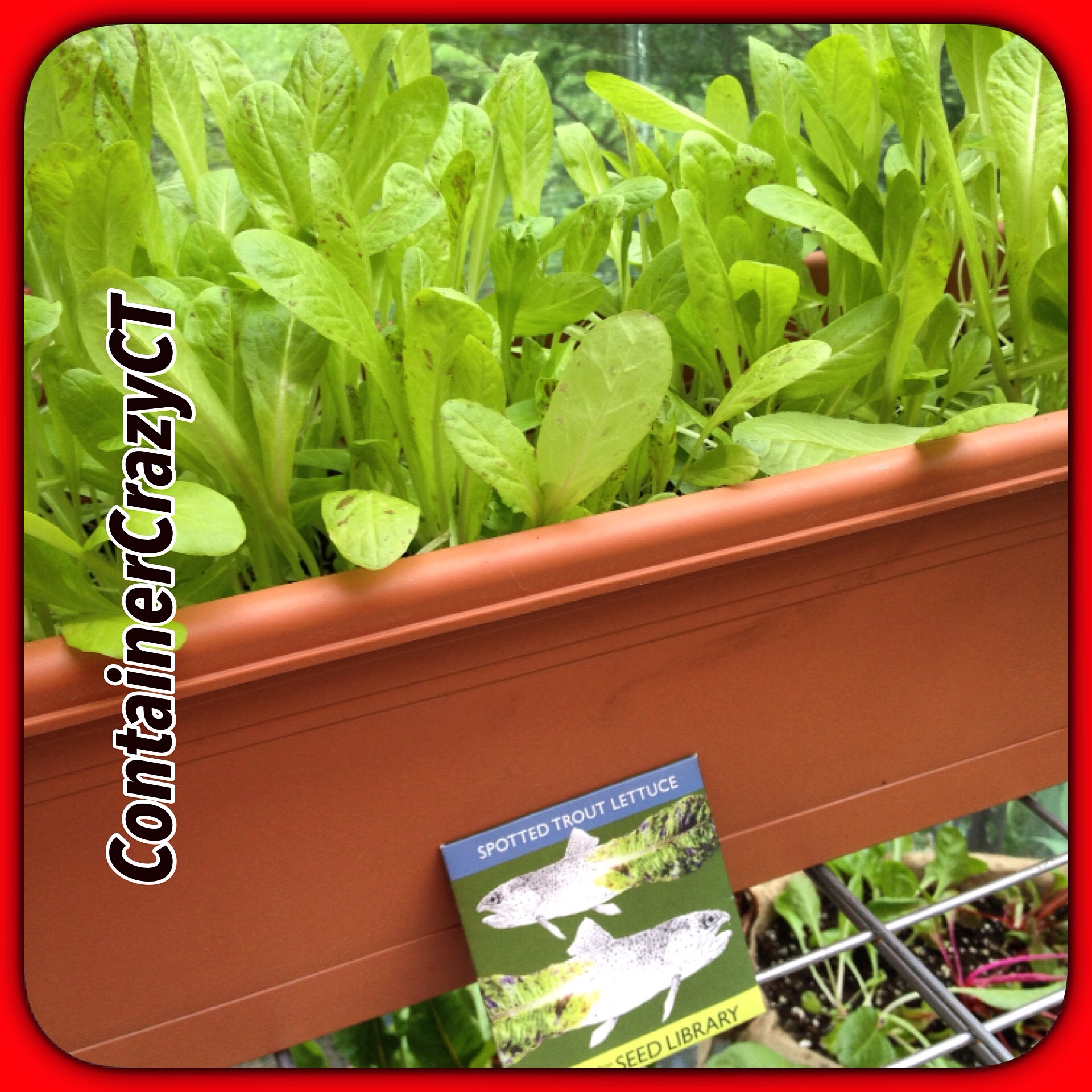 I got started a little later than normal this year with seeds, but been doing lots of mixed lettuces in pots and window boxes. This shows Spotted Trout Lettuce. The seed was purchased at the flower show in Hartford last winter. The Seed Library has artists draw or paint various pics for their seed packets. Here you see the lettuce is coming along nicely, and it was eaten. Every bite reminds me of my Father’s gardens which he still maintains today. His daughter however prefers the container route for gardening – and lettuce is fun to do in pots! I probably will have some of these available this weekend at the market – I even prepare and grow pots of mixed lettuce for my bunny – she is starting to eat better than me! Yup, I put the pots in her rabbit cage area for her to nibble on as she sees fit.