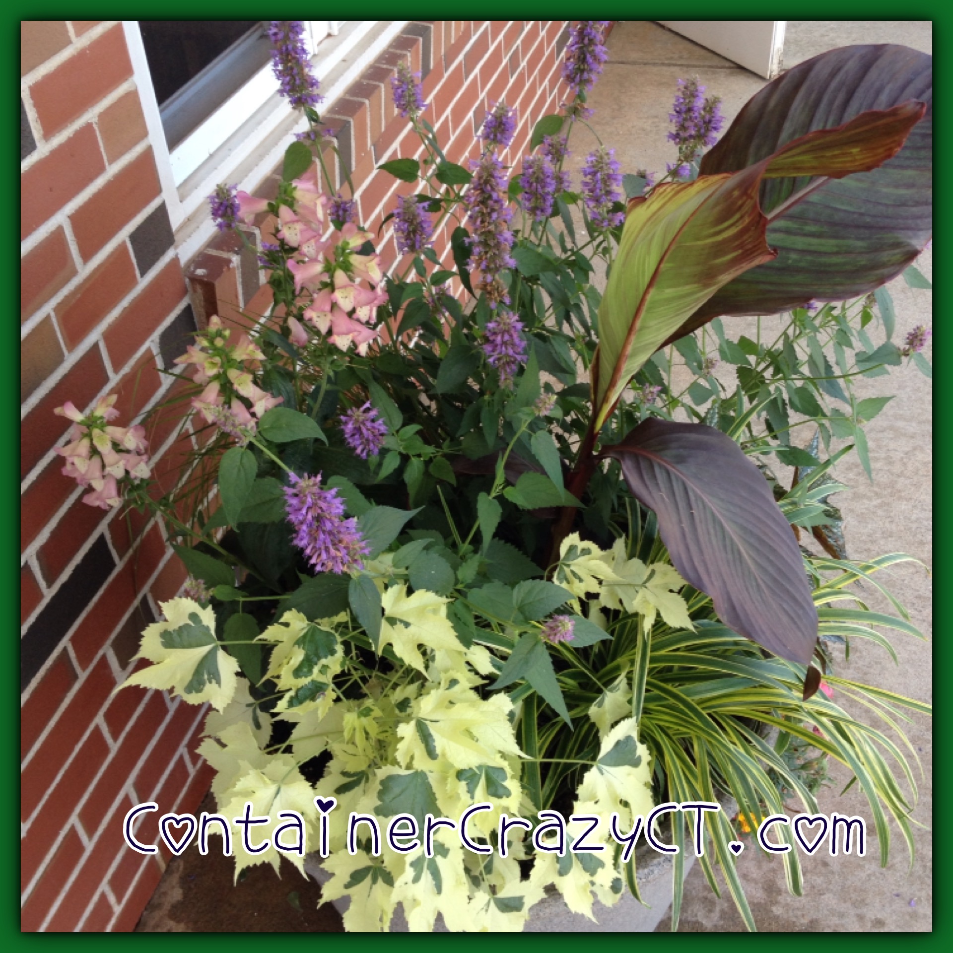 These photos above are of a container garden at a client’s business. She does an excellent job of watering it, and it contains a Canna, Digiplexis ‘Illumination Flame’, a variegated Liriope, Agastache ‘Blue Boa’, and Flowering maple. Just recently I trimmed up the Agastache for her, and also cut off one of the blooms of the Digiplexis, which is a new plant on the scene resembling foxglove, however, this one blooms repeatedly by sending out new shoots all summer. One thing everyone who got one of these from my workshop in May have commented on is the bottom flowers on the tallest stem of the Digiplexis plant start to fall off so I tell them to just snip it off – you will be sure to get more new shoots from this plant once it sets in and gets going.