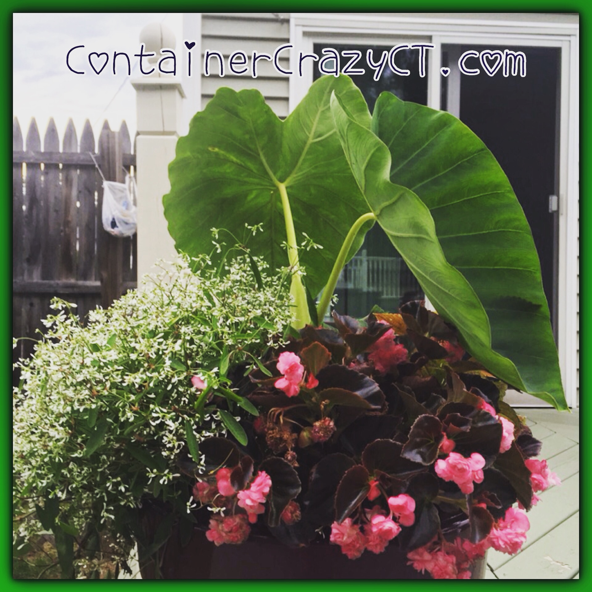 This container garden has a nice perennial called, Ceratostigma plumbaginoides (Plumbago, Leadwort) which is sprawling over the edge on the right side in this photo. A “sprawler” is a term I came up with this year to explain how some plants don’t spill over (spillers), instead they sprawl and gracefully reach out at the edge of the pot. This perennial will bloom blue flowers by late summer; the buds are forming now, and I’m excited because it is a “returner” in this big pot from last season. As I discussed in my workshops this year, Perennials with Power return. This plant likes partial shade or full sun. Here it is in part shade, it gets the eastern morning sun which suits the elephant ear in the center as well. As I mentioned above, I sometimes insert seeds into container gardens and note Nasturtium which you can see here on the left trailing out of the pot too. This container may not have tones of flashy flower colors – but I adore it because it is lush and full – and healthy.
