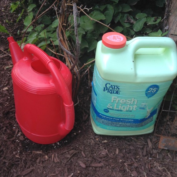Skip the Heavy Watering Can – Attach a watering wand to your garden hose and drag it to your container garden locations. It is way easier than using a watering can which requires constant refilling and carrying. Also, while you are at it, if you have any extra watering cans or water bottles, place them near your pots and fill them with water at the same time for the next day’s watering to save a step or water on the fly. Another good choice is installing a rain barrel on your deck or patio to capitalize on rain water harvesting to use for watering your plants. I like to recycle the big cat litter jugs as containers to hold water when I need to water container gardens not reachable by the garden hose. They are large and easily washed out before the first use.