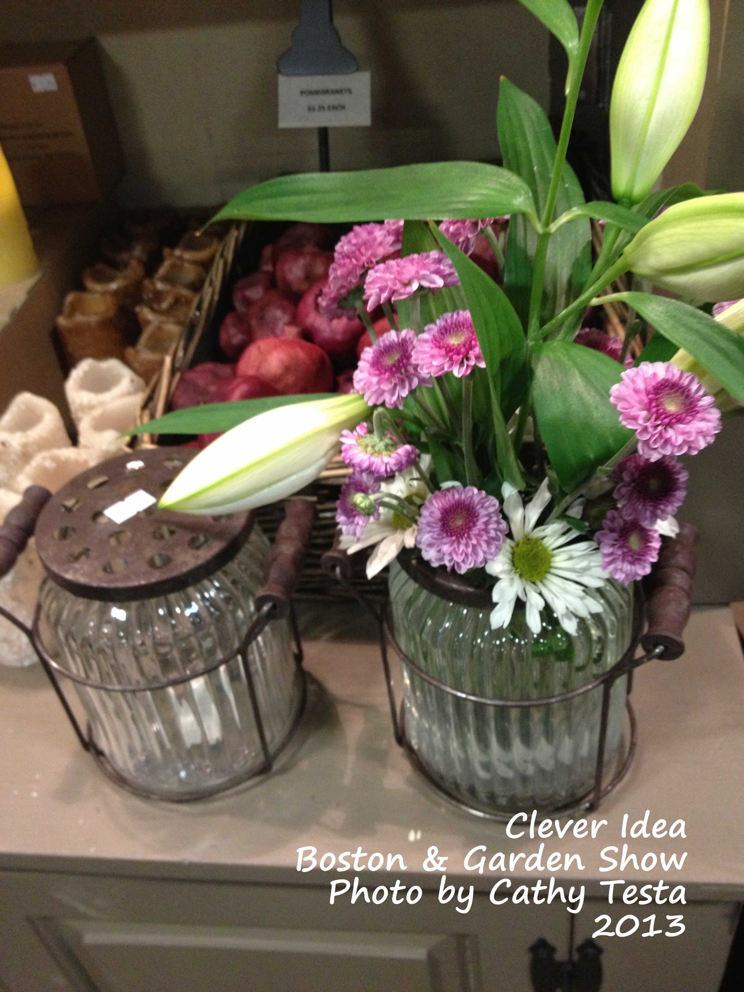 My friend and I both thought these little glass jars, resembling mason jars, with holes drilled in the top cover to insert fresh cut flowers, was very clever. We spotted them at the Boston Garden & Flower Show last weekend. I didn’t buy one, because frankly, I thought, gee, I could make one of these myself – I have tons of old mason jars stocked in my garage, some are made with blue glass. And I know how to use a power drill!