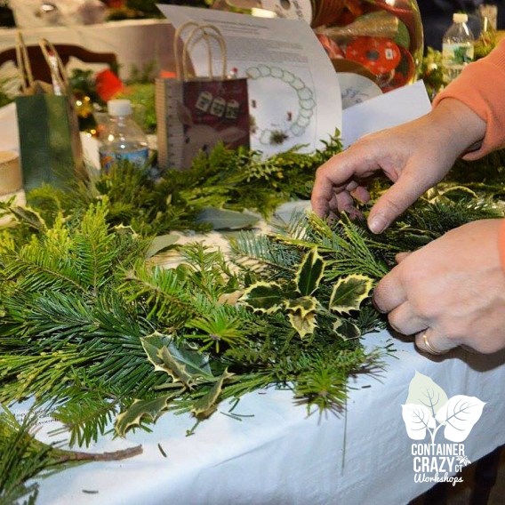 Gloves. Sap, sap, sticky sap from your fresh holiday greens, like the balsam fir, will start to really dry out your hands while making a wreath. A box of disposable gloves is really helpful, especially because as you continue to work, your hands may sweat or the gloves may get torn, so I like a box of gloves nearby. I will grab a fresh pair as I continue to make wreaths and kissing balls by hand for my orders.