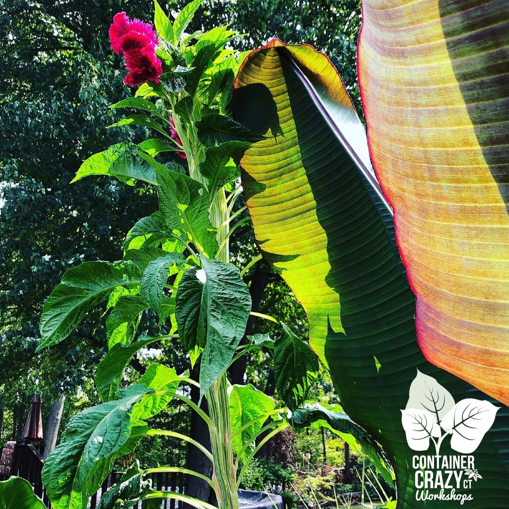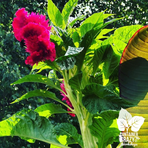 Another wonderful feature of using tropical plants (not hardy to CT and must be stored in winter), is the fact they are used year after year. With having good luck with my storage technique for so many years, it baffled me as to why I had some back luck with storing them this year (i.e., the rot spots). Anyhow, the photo above was when I planted the same bulbs/tubers in 2020. I think I had purchased the tubers of these in 2019 or 2018. They are also super easy to care for once they start growing in the planters outdoors, with relatively no problems, and with this year’s tropical heat all summer, they loved it. They tend to get the most full and larger by this time of year and into the fall season. Another bonus to growing them is they last all the way till end of October. BTW, they do get flowers and I successfully grew one plant from seed I collected last year. I made a baby from the seed of this plant for the first time ever. I’ll write about that some other time.