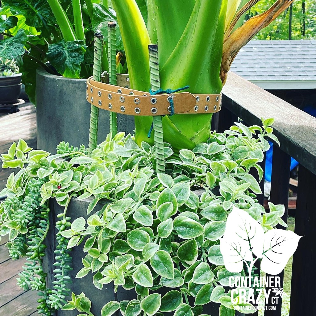 I’m not sure why I decided to plant the largest of my tubers in the smaller planter anyhow. I think maybe I was considering that it will grow very tall in smaller planter, and the taller planter would look nice with the huge elephant ear leaves sitting on top of their long stalks next to the lower planter to the side of it. Next year, I will make a note to plant it in the larger of the two planters I typically use each season for these Upright elephant ear plants. The rebar and belt seems to be working as a splint of sorts. As you can see from this above photo, the base of the plant is super thick and becoming heavy. I also remember, I probably didn’t plant the tuber deep enough. I was concerned about some rot experienced when I took them out of storage this spring.