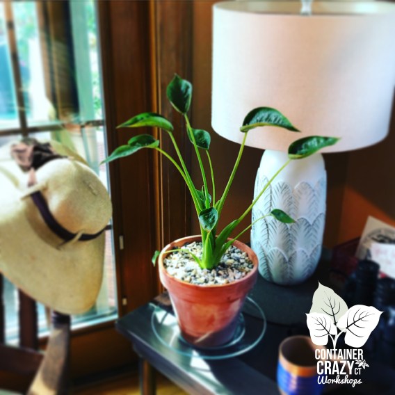 It started off in a tiny 3″ square nursery black pot. I potted it into a new terracotta pot and had it outdoors all summer. Usually, I store Alocasias by storing their tubers (round like bulbs located under the soil) only, but this is a tiny Alocasia, in fact, more along the lines of a dwarf. It makes it a houseplant candidate in my book, at least, I can test it out as such this year.