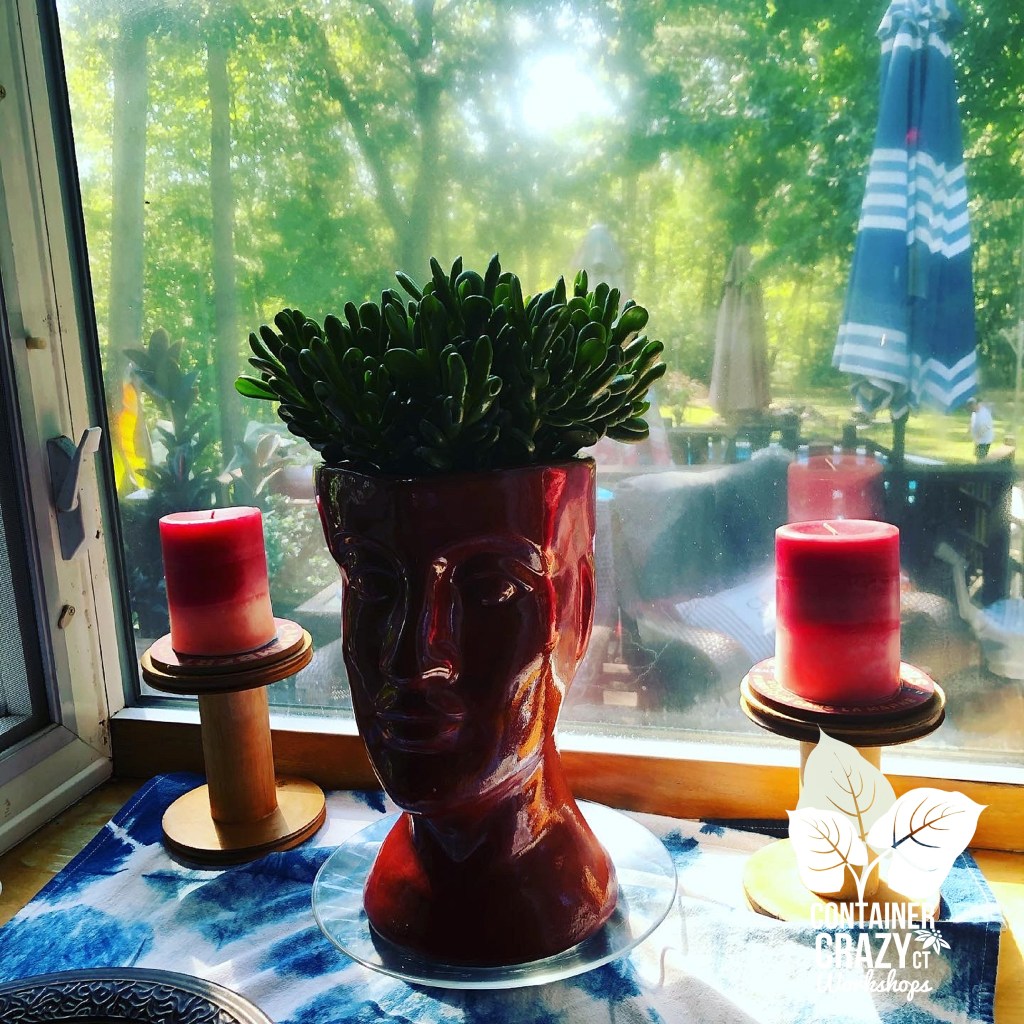 However, because this Jade plant is so healthy right now, this week of September 7th, I wanted to take this gorgeous red head planter in before the beautiful Jade plant in it experiences any fall weather related stress. It has grown so much and has done well in this planter.