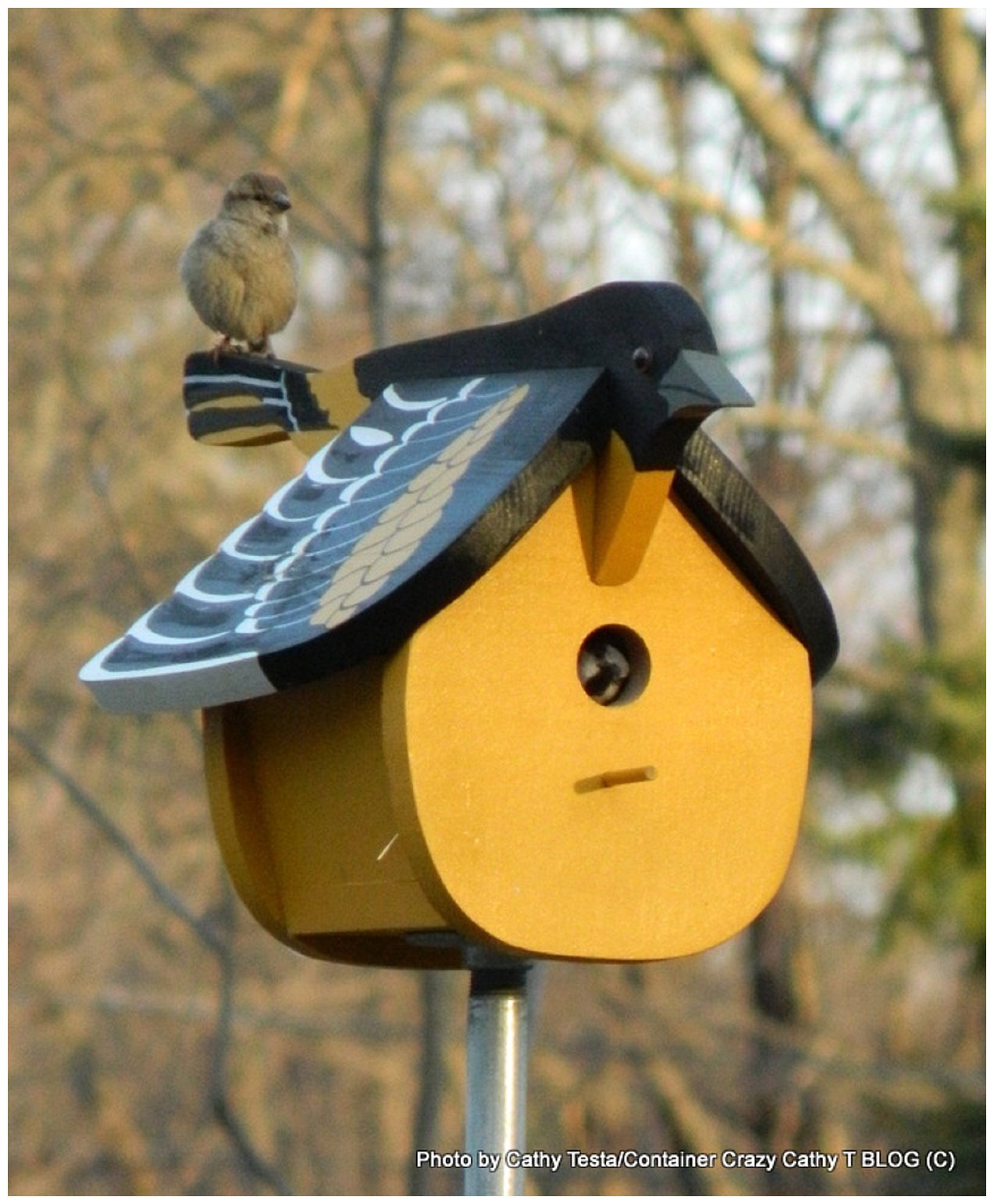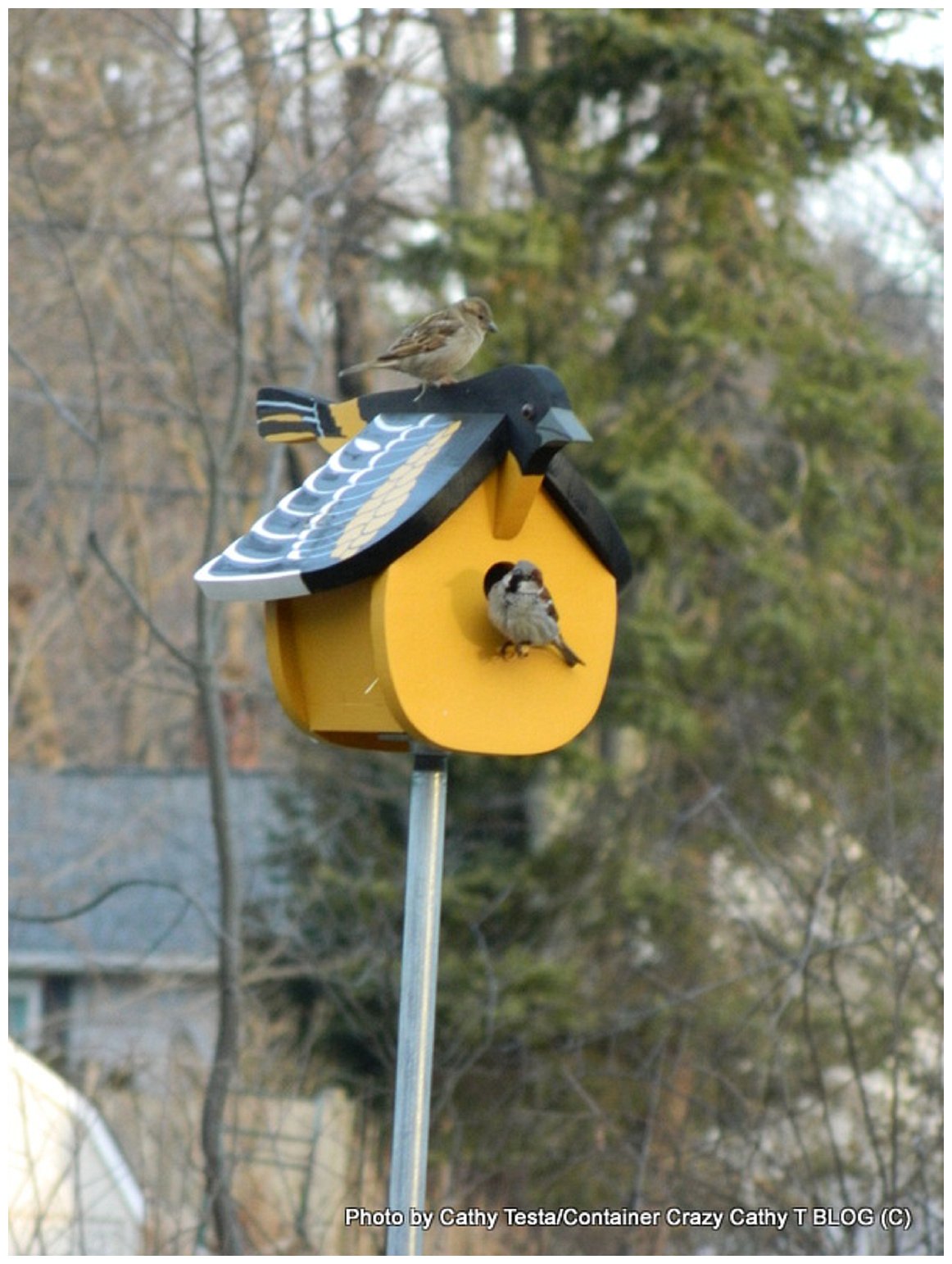 And here’s a photo of one at my home with two varieties of Coreopsis (tickseed) – one hardy (‘Jethro Tulll’) and one not (‘Cha cha cha’) and the annual, Persian Shield (purple foliage) with a gnome which keeps coming back to my container gardens every year. I recently moved this pot because one plant got powdery mildew – so it seemed to need some more air circulations which helps this problem, and I sprayed that with some organic spray, but I hate how powdery mildew will damage foliage. Hopefully, this will look better soon as the other two spiller plants come out to grace the sides of the blue pot.